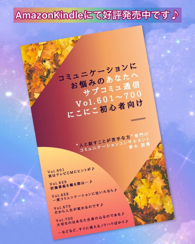 人と話すことに不安を抱えている方へ向けて、7冊目の電子書籍『コミュニケーションにお悩みのあなたへ サプコミュ通信 Vol.601〜700 にこにこ初心者向け』を出版しました。